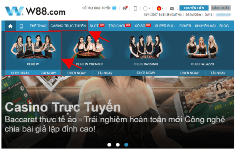 Bước 3: Bấm vào mục Casino trực tuyến vào chọn thể loại mình muốn tham gia chơi.